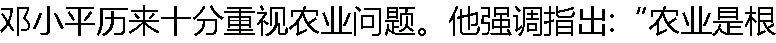 本,不要忘掉”。“农业搞不好,工业就没有希望,吃、穿、用的问题也解决不了。”他告诫我们:“90年代经济如果出问题,很可能出在农业上;如果农业出了问题,多少年缓不过来,整个经济和社会发展的全局都要受到严重影响”。这些话的意思是,农业( ) |