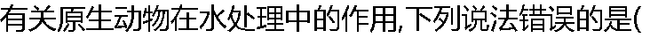 | A:有净化废水中有机物的功能 B:可以促进活性污泥的絮凝作用 C:可以作为废水生物处理的指示生物 D:当水处理效果好时,活性污泥中的原生动物以游泳型纤毛虫为主 |