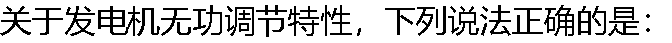 | A:无功调节特性反映发电机端电压与输出无功电流的关系 B:无功调节特性反映发电机励磁电流与输出无功电流的关系 C:无功调节特性就是调压器的工作特性 D:无功调节特性是调压器、励磁机和发电机工作特性的合成 |