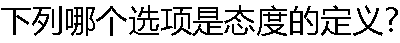 | A:态度是对事物的一种描述或信念 B:态度是指从事某种行为的意向。 C:态度是评估一些人、物体或事件的情感部分。 D:态度是关于物体、人物和事件的评价性陈述。 E:态度是一个用来测量对象的价值,对人或事件进行了评价。 |