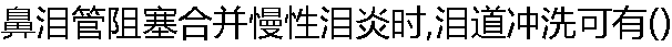 | A:冲洗液完全自原路返流. B:冲洗液自另一泪点返流伴有黏液 C:冲洗液由上或下泪点进入后,从另一泪点返流 D:冲洗有阻力且冲洗液部分进入鼻腔 E:冲洗液返流且伴有黏脓分泌物 |