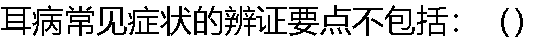 | A:辨耳痛 B:辨耳脓 C:辨耳郭 D:辨耳鸣耳聋 E:辨眩晕 |