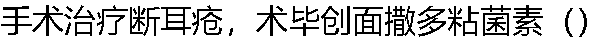 | A:干燥疗法 B:酒精消毒外耳道 C:外耳道口用消毒棉球堵塞 D:外耳道滴药 E:鼓膜修补术 |