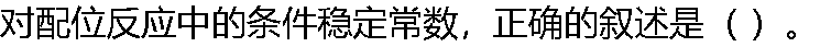 | A:条件稳定常数是实验条件下的实际稳定常数 B:酸效应系数并不总是使条件稳定常数减小 C:所有的副反应均使条件稳定常数减小 D:条件稳定常数与配位滴定突跃无关 |
