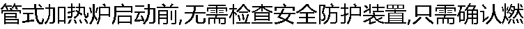 | A: 燃料和空气供应系统是否完好 B: 炉管有无腐蚀和变形 C: 安全防护装置是否正常 D: 仪表是否校准 E: 储液罐液位是否正常 |