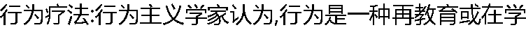 习的过程。通过行为疗法,适当的或有益的行为会被增强,同时偏差的或无益的行为会被消除。行为疗法的作用是利用强化方式协助儿童达到预定的目标。 |